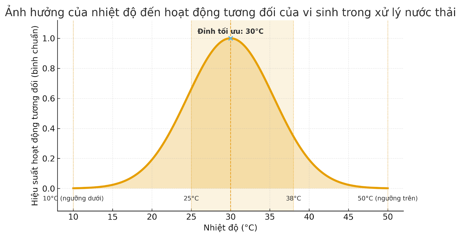 Nhiệt độ ảnh hưởng trực tiếp đến tốc độ trao đổi chất và sinh sản của vi sinh vật. Khi nhiệt độ tăng trong ngưỡng cho phép, tốc độ "ăn" và xử lý chất ô nhiễm của chúng cũng tăng theo. Ngược lại, khi nhiệt độ giảm, mọi hoạt động đều chậm lại.