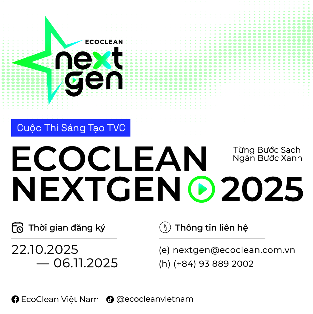 EcoClean Việt Nam chính thức phát động Cuộc thi Sáng tạo TVC ECOCLEAN NEXT GEN 2025 với chủ đề “Từng bước sạch, ngàn bước xanh”, dành riêng cho các bạn sinh viên đam mê sáng tạo, yêu môi trường và mong muốn lan tỏa thông điệp sống xanh đến cộng đồng.